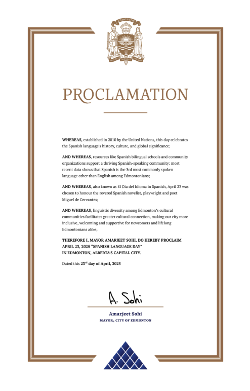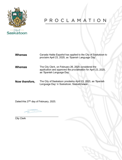 Desde hace tres años, las ciudades de Saskatoon y Edmonton se han unido a esta celebración proclamando el 23 de abril como el Día del Idioma Español, reforzando el compromiso con el reconocimiento y fomento de nuestra cultura.